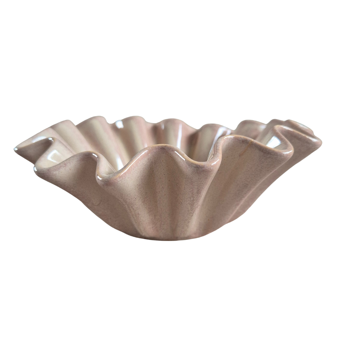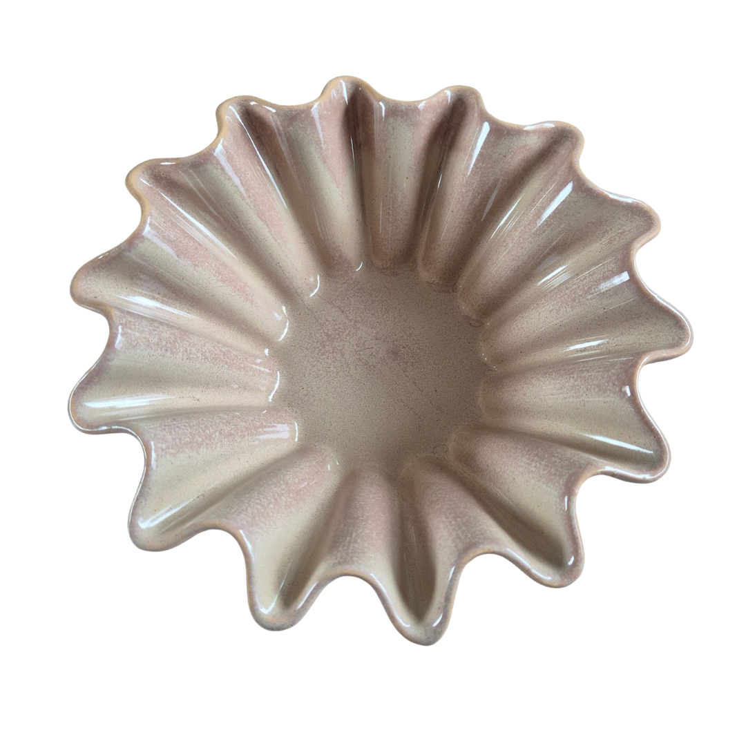 Stijlvol aardewerk schaaltje in beige-roze met speels ribdesign, perfect voor kaarsenzand of handig als sieradenschaaltje. Ideaal om een warm en liefdevol vuurtje te creëren of als decoratief woonaccessoire op tafel, kast of dressoir. Een subtiele blikvanger voor elk interieur.