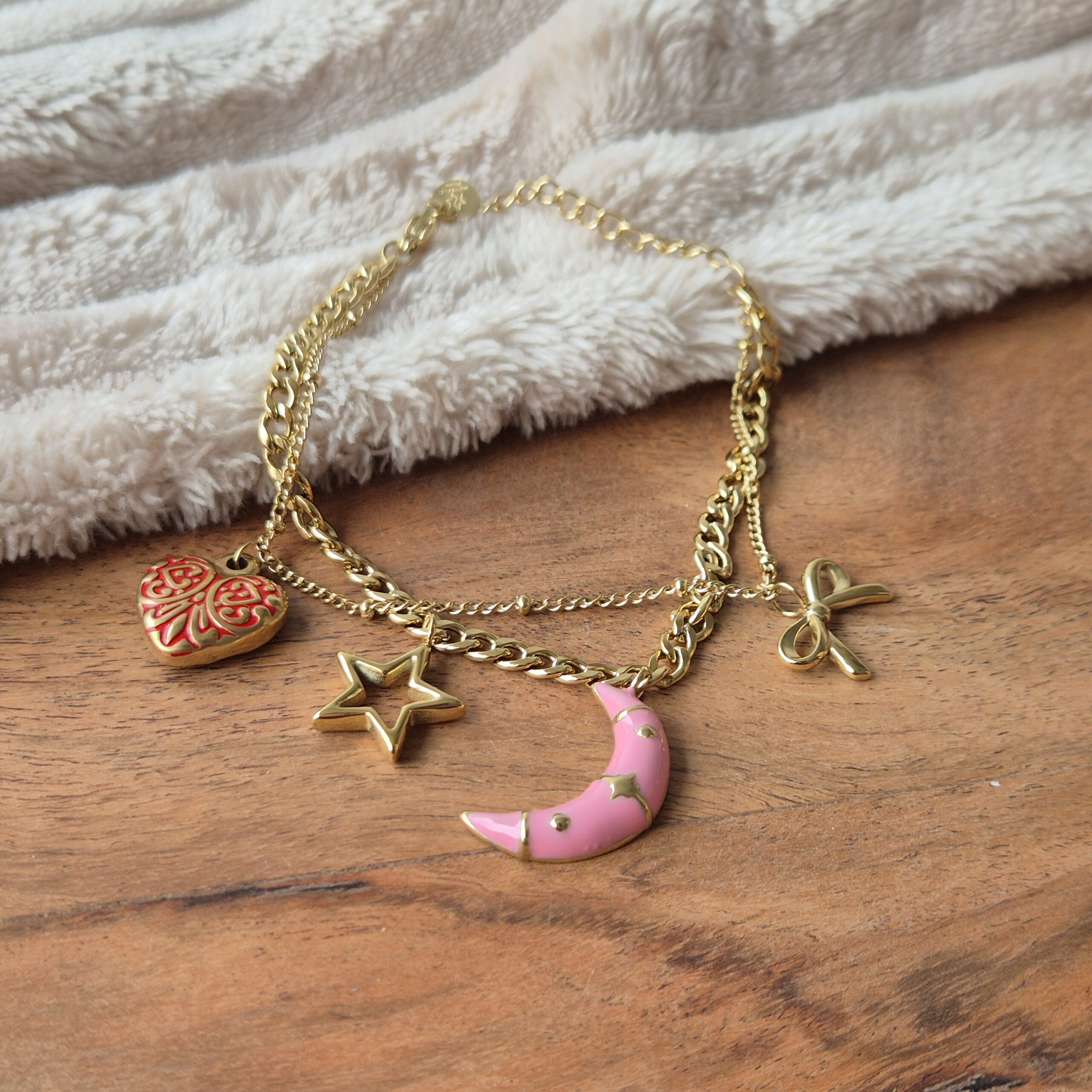 Deze gouden bedelarmband met bedels in de vorm van een hart, ster, maan en strik geeft elke outfit een speelse en elegante uitstraling. Gemaakt van stainless steel, dus duurzaam en kleurvast. Dankzij de verstelbare lengte draagt hij comfortabel om elke pols.