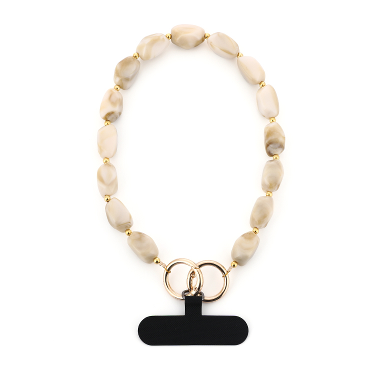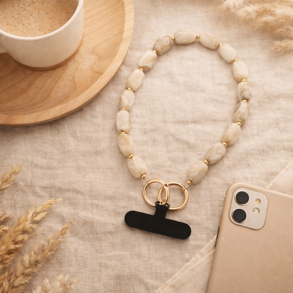 Dit universele telefoonkoord met natuurlijke beige kralen en gouden accenten geeft je smartphone een trendy en luxe uitstraling. Geschikt voor vrijwel alle smartphones en hoesjes dankzij het universele bevestigingsplaatje. Perfect voor dagelijks gebruik en eenvoudig te combineren met elke outfit.