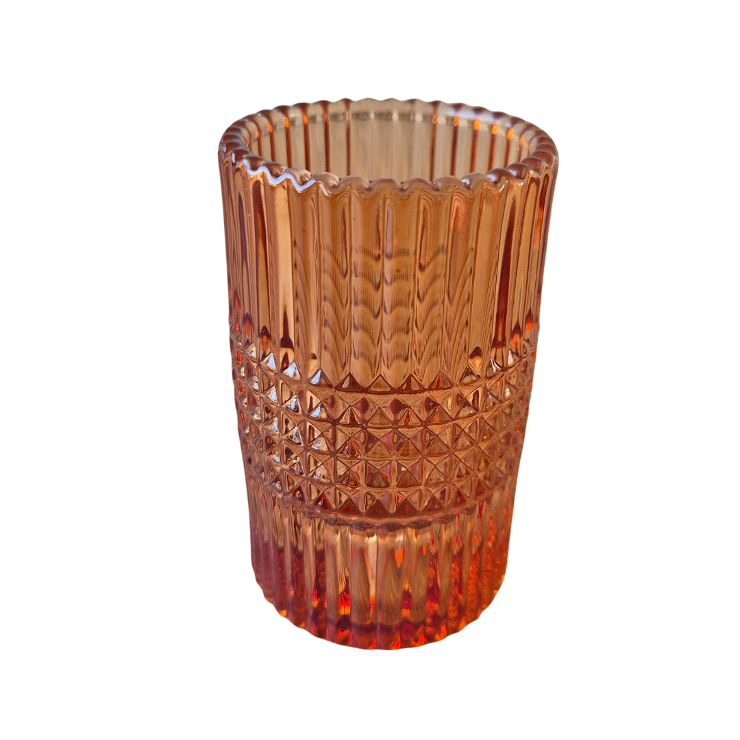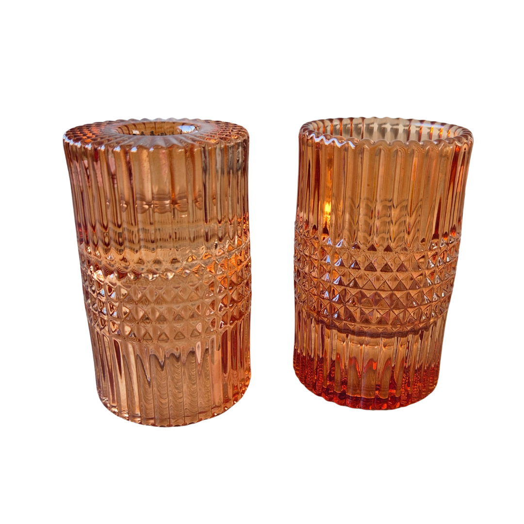 Stijlvolle kandelaar en waxinelichthouder in één van oranje sandstone glas. Door het omkeerbare design geschikt voor dinerkaarsen en waxinelichtjes. Een warme en moderne woonaccessoire voor extra sfeer in huis.