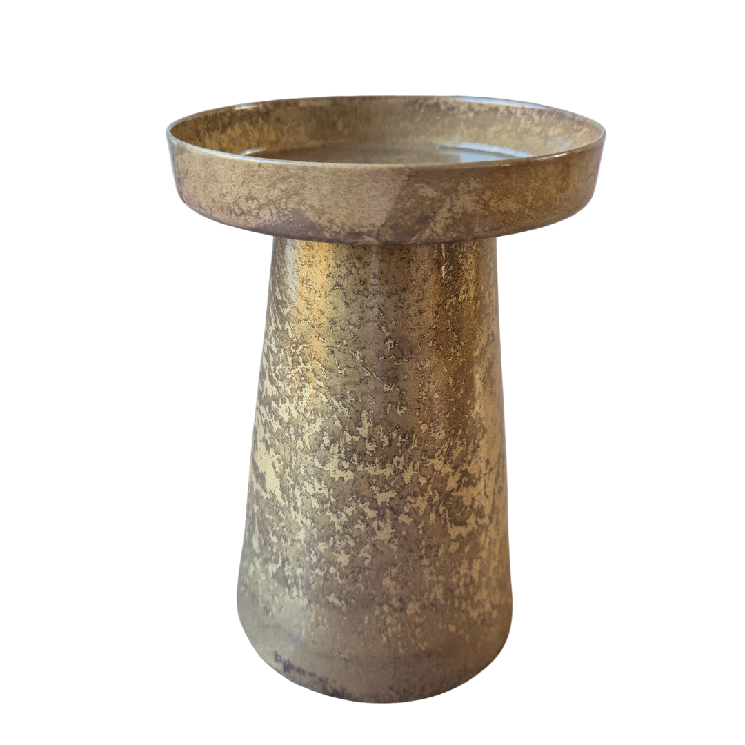 Deze metalen kandelaar is een stijlvolle woonaccessoire met een robuuste en luxe uitstraling. Dankzij de brede schaal en warme metaaltint is hij veelzijdig in gebruik en perfect voor sfeervolle momenten. Ideaal voor op tafel, een dressoir of bijzettafel en eenvoudig te combineren met andere woonaccessoires.