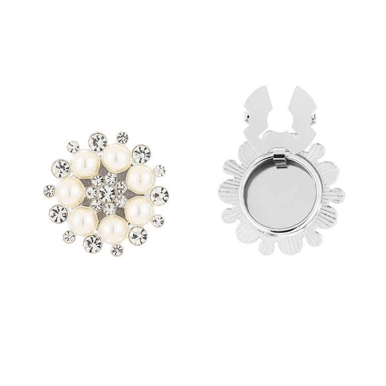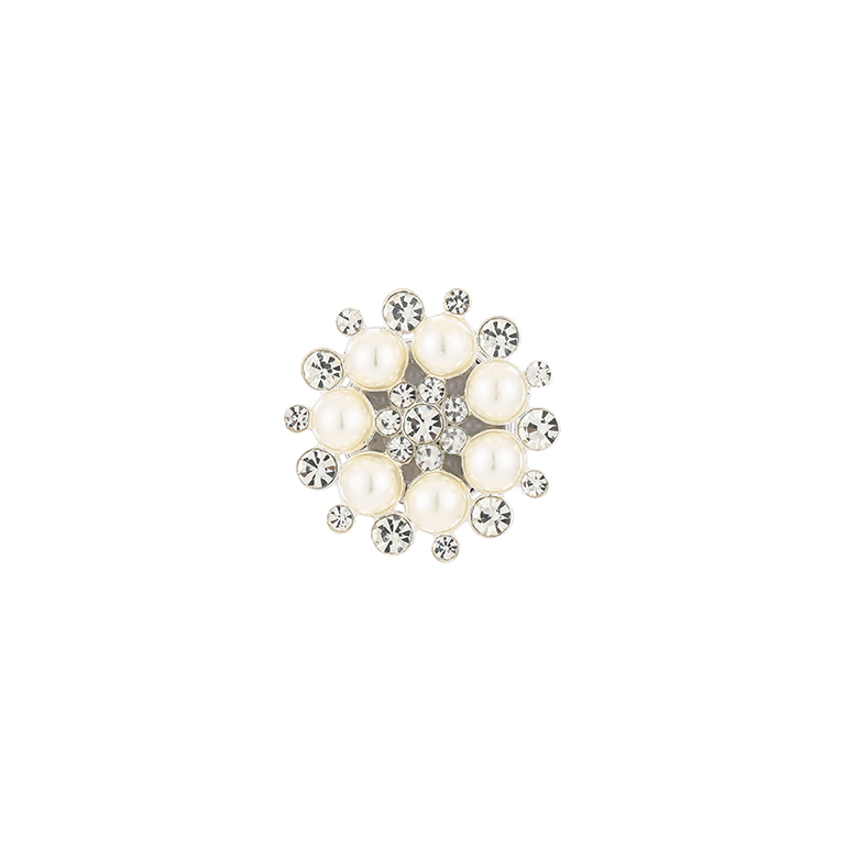Deze elegante zilverkleurige knopen clips met parels en strass geven elke outfit een luxe uitstraling.