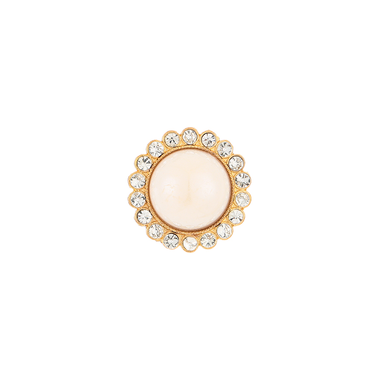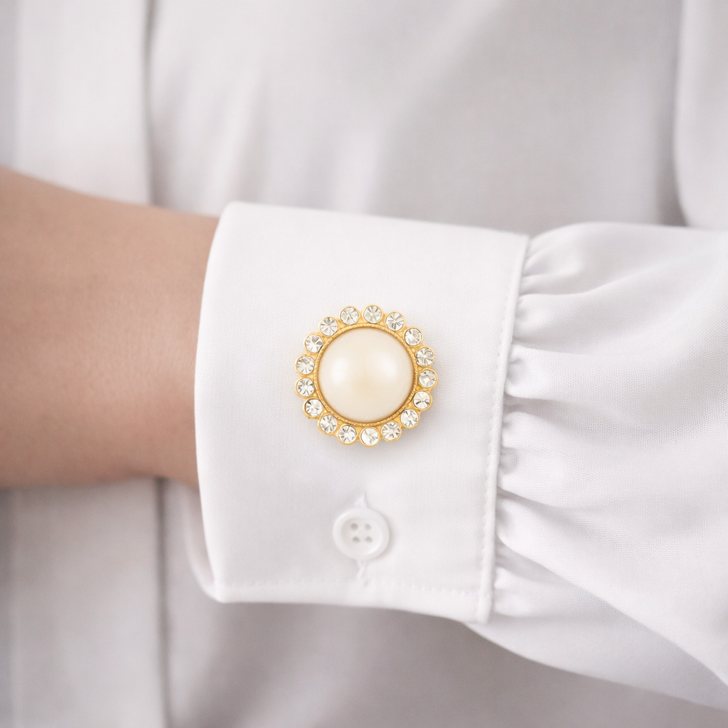 Deze elegante goudkleurige knopen clips met parel en strassrand geven elke outfit direct een luxe uitstraling.
