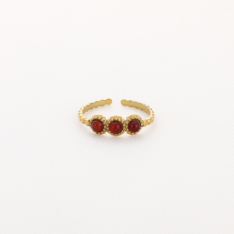 Deze verstelbare gouden ring met rode agaat stenen is een stijlvolle eyecatcher met een warme, luxe uitstraling. De drie dieprode steentjes geven de ring een speels en elegant karakter. Dankzij het verstelbare design past de ring altijd comfortabel om je vinger. Perfect om solo te dragen of te combineren met andere ringen voor een trendy, gelaagde look. Een uniek sieraad voor elke sieradenliefhebber.