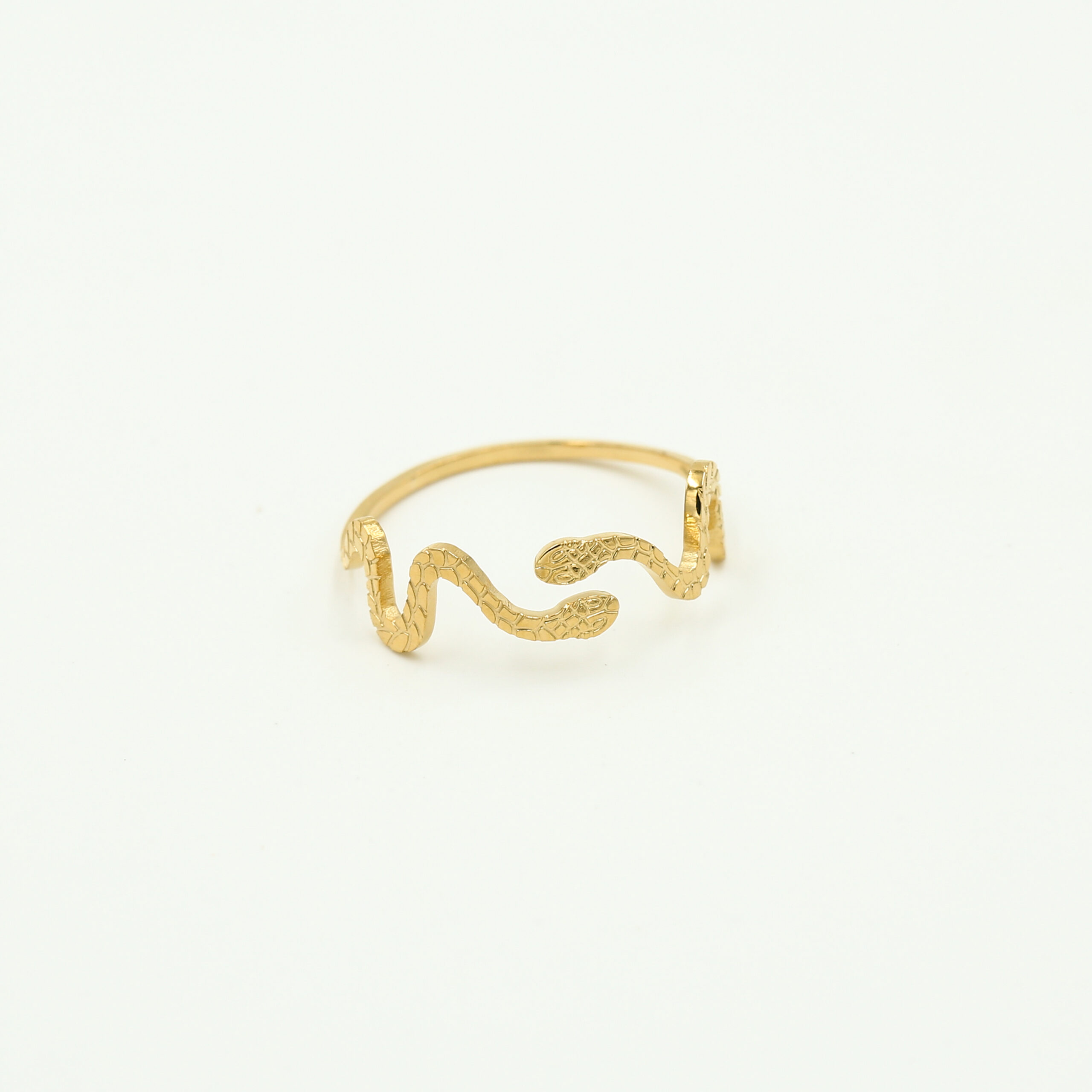 Deze verstelbare gouden ring in slangvorm is een echte eyecatcher met een edgy en stijlvolle uitstraling. Het unieke design met verfijnde details geeft de ring een moderne en speelse look. Dankzij het open, verstelbare model past de ring altijd perfect en comfortabel om je vinger. Ideaal om solo te dragen als statement piece of te combineren met andere ringen voor een trendy, gelaagde stijl. Een must-have voor liefhebbers van opvallende sieraden.